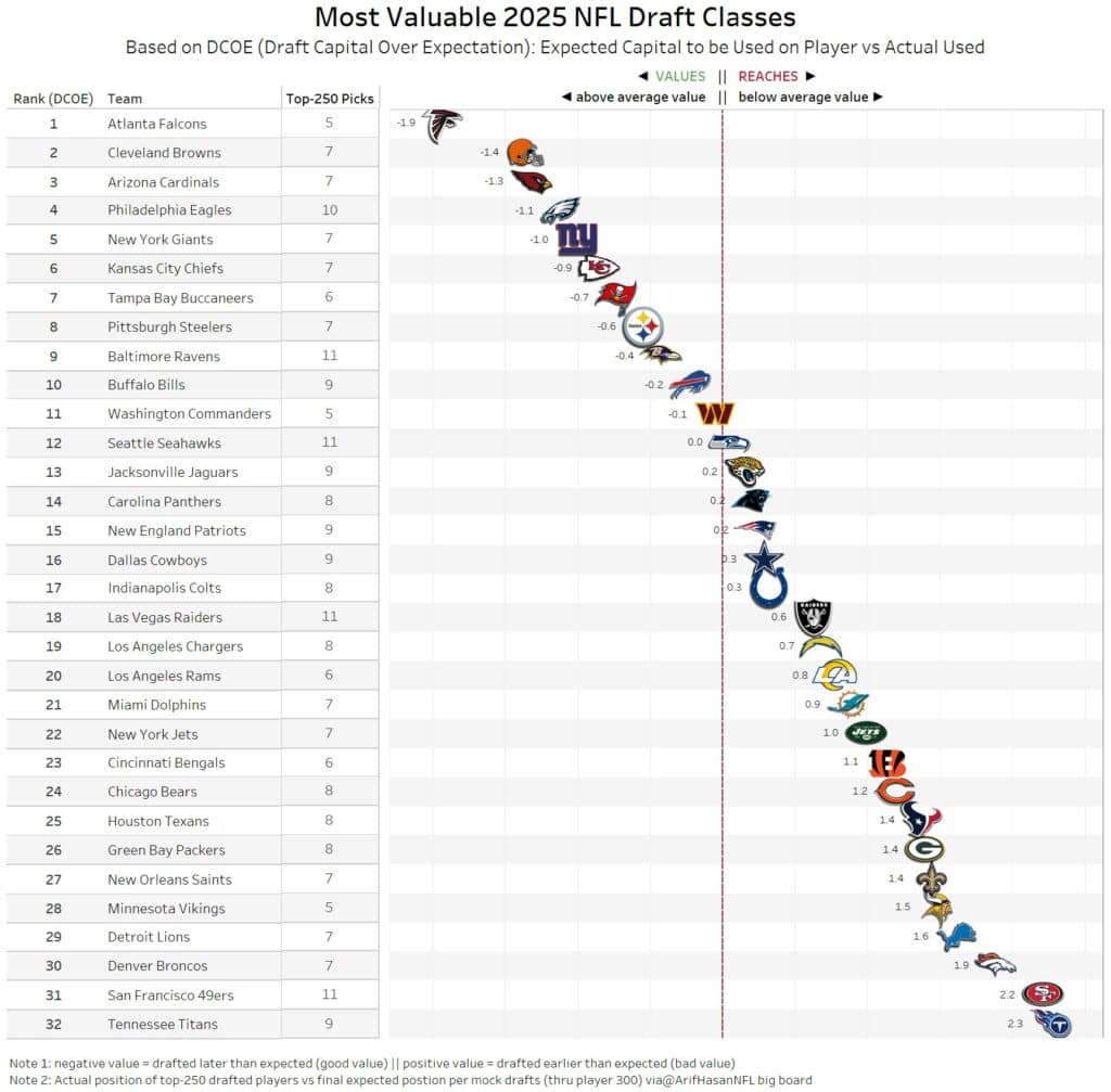 Their biggest reach was Hayden Conner in the sixth round, but reaching for a player in the sixth round is certainly not a problem, and they finished #3 overall in 2025 draft value.