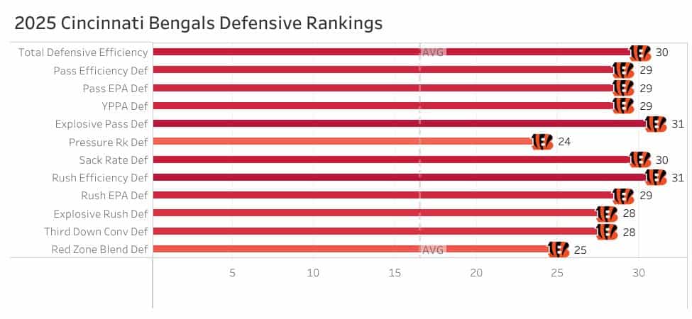 Not just bad against the run, the Bengals also ranked 29th in yards per attempt allowed and 28th in EPA per pass allowed.
