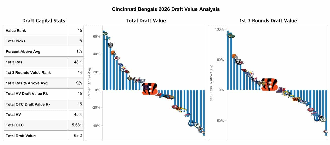 The Bengals have the 15th-most draft capital according to our Sharp Football Draft Value.