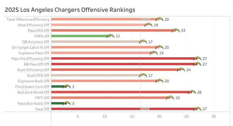 The Chargers finished 16th in pressure rate (36.9%) last season, ranking 10th with 45 sacks.