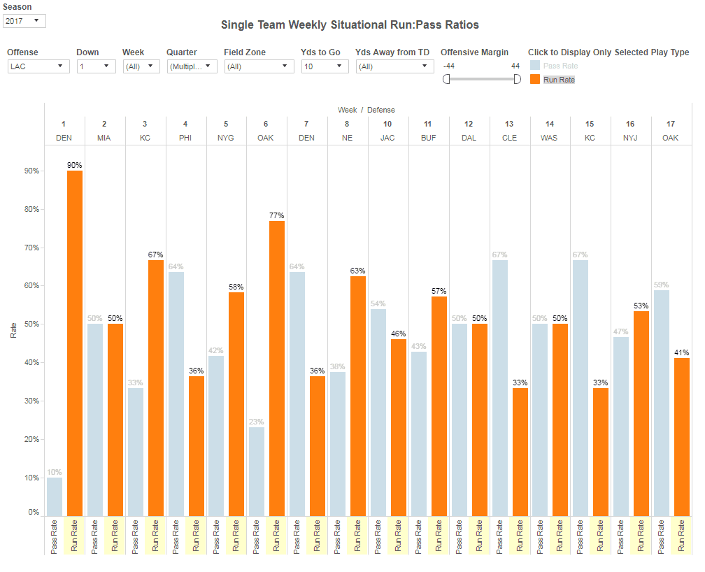 In 2017, Anthony Lynn took over the team. The run-first ideology was evident. Over their first eight games, the Chargers ran the ball on 60% of 1st and 10 plays in the first half, the NFL's third-highest rate. This was even worse than what their 2016 campaign which was a 56% run rate.