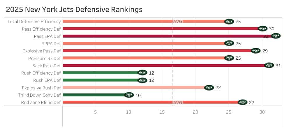 The Jets ranked dead last in pressure rate last season and 31st with just 26 total sacks.