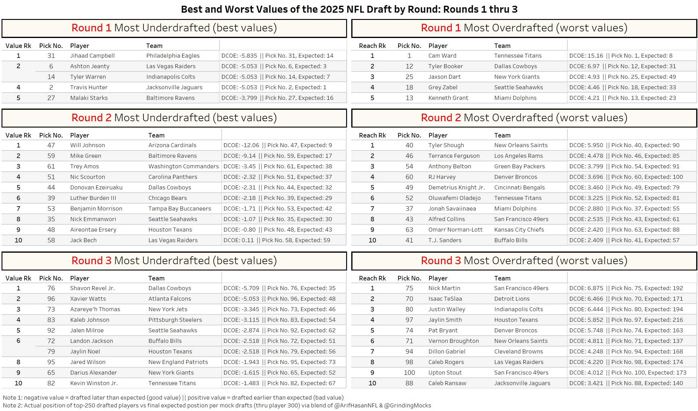 But they gave some value back with their three picks in Rounds 2 and 3, taking all 3 defensive players slightly ahead of projection: