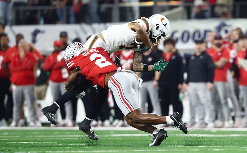 “I was told by an NFC scout that Ohio State all-class safety Caleb Downs had a couple of issues flagged during his medical check…I was told that Downs was flagged with a partially torn meniscus this week. That is not a serious concern, but also being flagged with a potentially degenerative ACL is.”