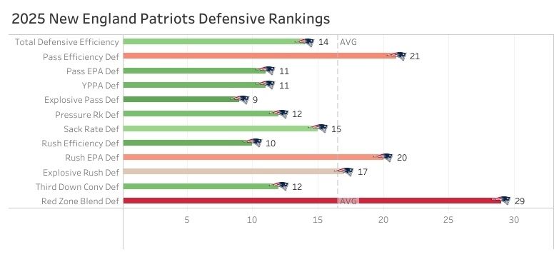The Patriots were good against opposing running backs in 2025, finishing sixth in yards allowed per carry (3.9) to the position and fourth in explosive run rate allowed.