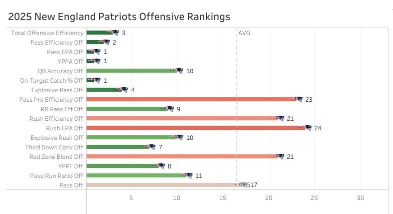 Maye led the NFL in quarterback rating (113.5), QBR (77.2), EPA per play (0.27), and was second in success rate (51.6%).