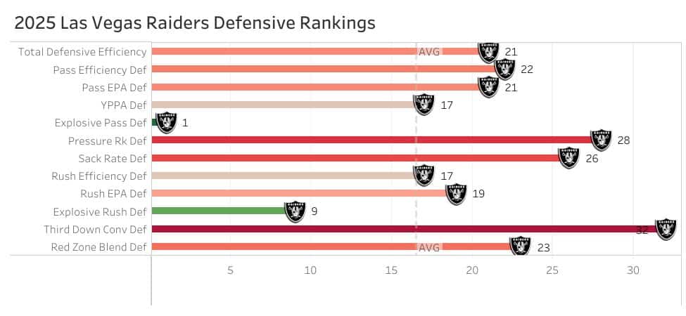 The Raiders gave up 7.0 yards per attempt last season (15th) and finished with a 1.5% interception rate (26th).