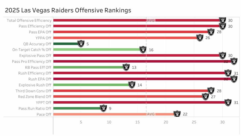 In 2025, their passers combined to rank 28th in the league in rating (81.5), throwing for 6.4 yards per pass attempt (27th), 9.8 yards per completion (30th), a 3.9% touchdown rate (26th), and a 3.7% interception rate (30th).