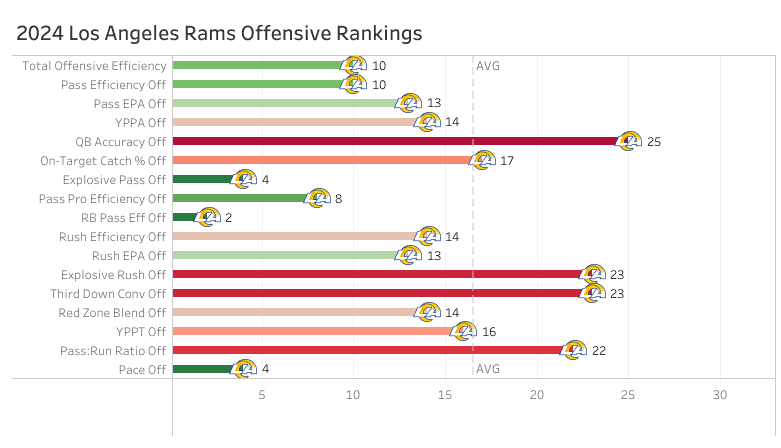 The Rams did not do well against the pass in 2024, allowing 7.6 yards per attempt (25th), a 9.8% big play rate (29th), and a 5.4% touchdown rate (27th).