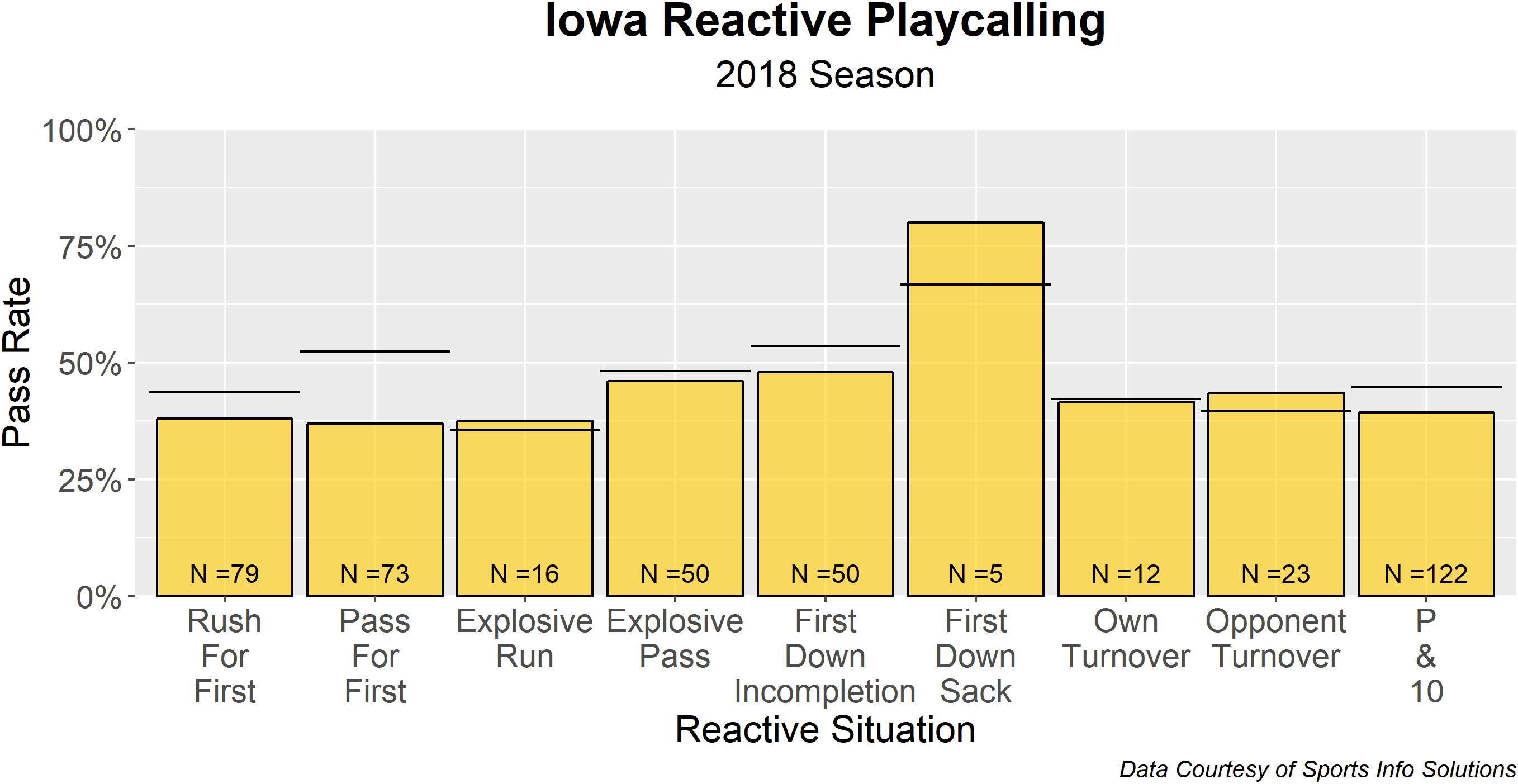 The black lines represent the league average rate for each reactive situation. “N =” indicates the number of times a team found itself in the specified reactive situation. Quarterback kneels were removed from the sample, so a team that kneeled the ball after hitting an explosive run to seal the game won’t have its pass rate watered down by such plays.