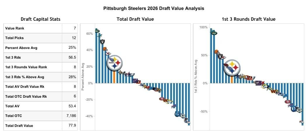 The Steelers have the 7th-most draft capital according to our Sharp Football Draft Value.