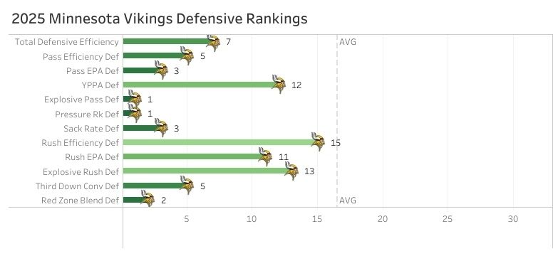 Minnesota suffocated opposing passing games in 2025, allowing 6.8 yards per attempt (11th) and finishing third in EPA allowed per pass.