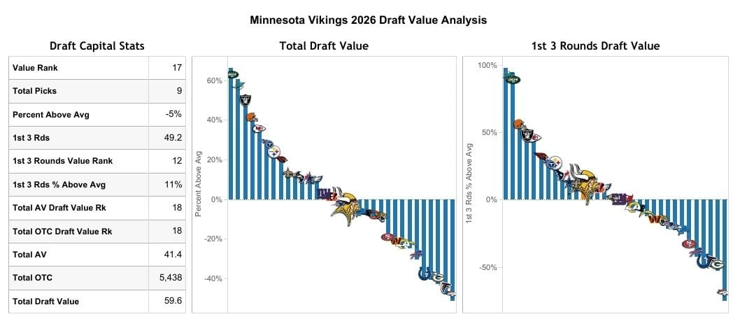 The Vikings have the 17th-most draft capital according to our Sharp Football Draft Value.