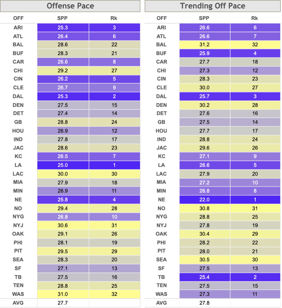 Unfortunately, many of the teams that are speeding up, aren’t necessarily teams we want to stack up in GPPs. But, grabbing pieces of those offenses as one-off plays in lineups with the stacks we’re going to outline here could be a profitable strategy this week.