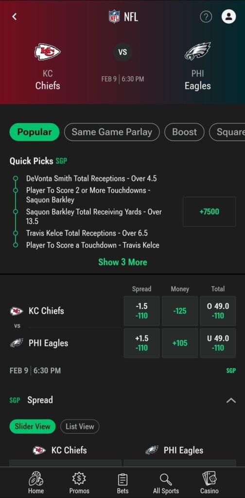 Suppose you're choosing a Super Bowl betting promo for Chiefs vs. Eagles with a first bet safety net. In that case, you should explore something with larger odds like a parlay, including legs like a Saquon Barkley touchdown, Dallas Goedert to go over in yards, and the Chiefs to still win by 1-to-13 points. For smaller wagers with bonus bets coming your way, feel free to bet on things like the spread (Chiefs -1.5) or Jalen Hurts to score a touchdown (he has five on the ground in his last two games against the Chiefs).